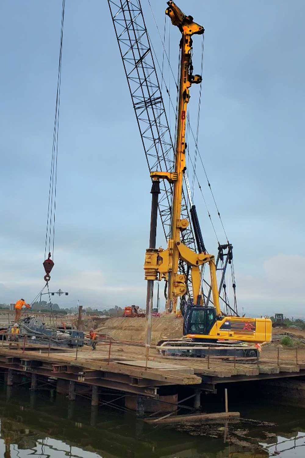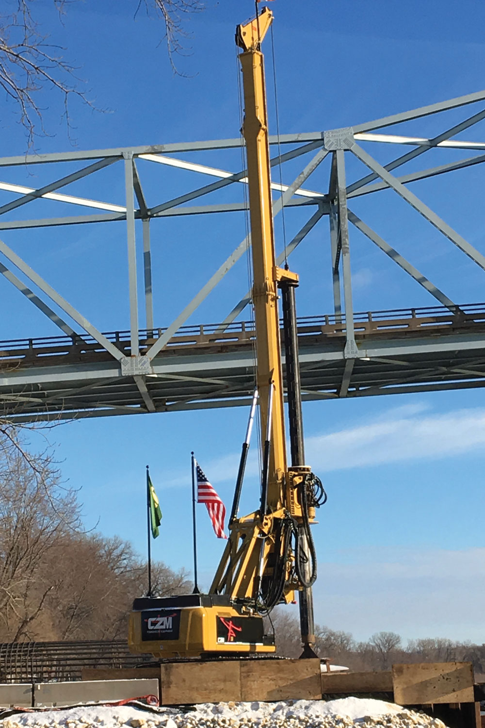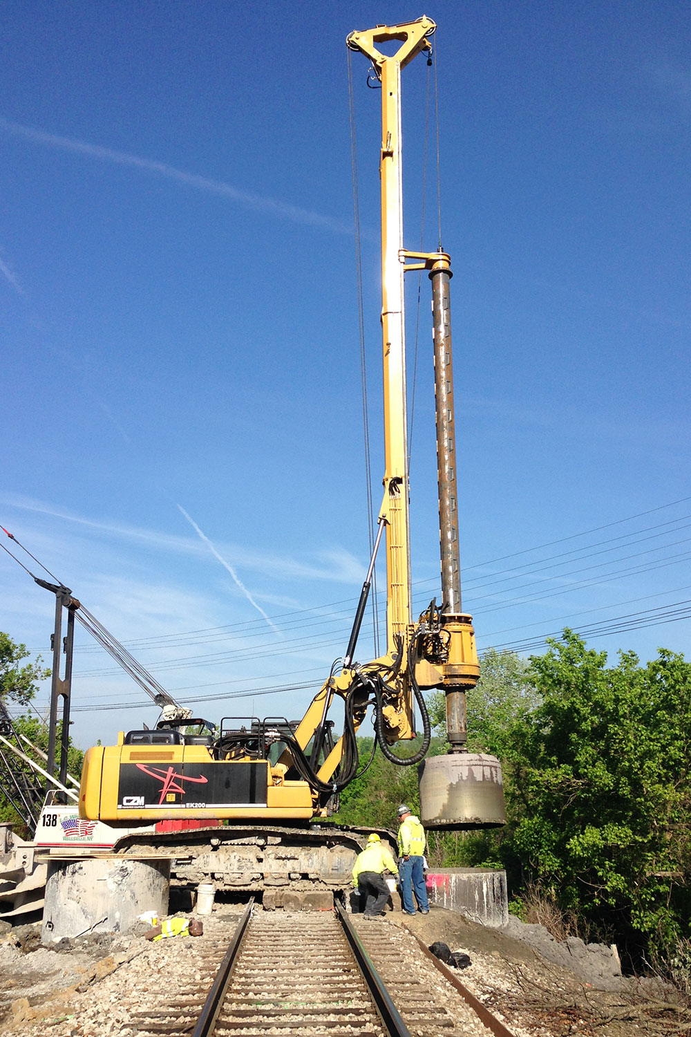 The EK200USM is a specialized machine designed by CZM for the foundations of Transmission Lines. It has a special parallelogram, where the tilt cylinders face down, allowing it work under very low overhead (20ft).